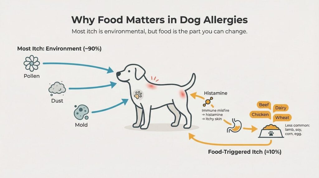 Most itchy dogs react to pollen, dust, or mold, not dinner. Veterinary dermatologists report that only 10 percent of canine allergy cases start in the food bowl, yet that small share is the one we can change tonight.
