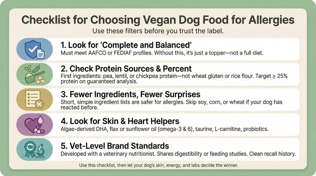 Vegan works only if the recipe also avoids any plant your dog already reacts to, such as soy or wheat. Quality brands flag common plant allergens and rely on pea, lentil, or potato proteins instead. Read the label, and you keep the nothing-to-trigger promise intact.