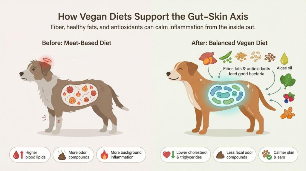In 2024, a peer-reviewed survey of 2,536 companion dogs, including 336 eating a complete vegan diet, found that plant-fed pets recorded fewer overall disorders and a measurable dip in skin and ear problems, the classic allergy hotspots.