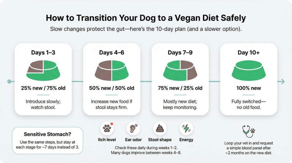 If your dog has a sensitive stomach, stretch each step to a full week. There is no prize for speed, only for a dog that eats eagerly and digests without drama.