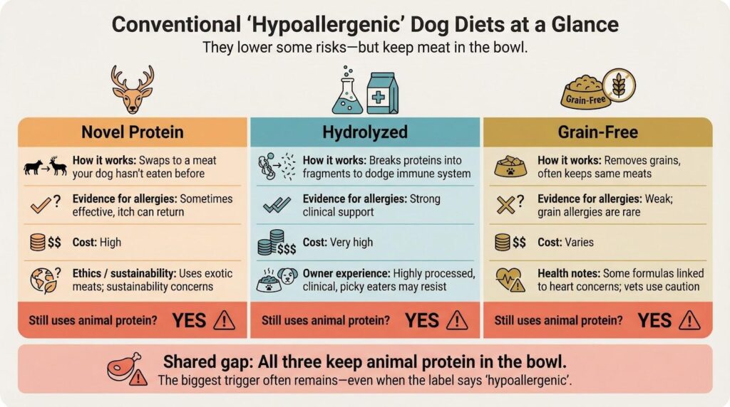 Bottom line: when food drives the itch, animal protein is usually to blame. That insight sets up our next head-to-head between traditional “hypoallergenic” diets and a plant-based approach.