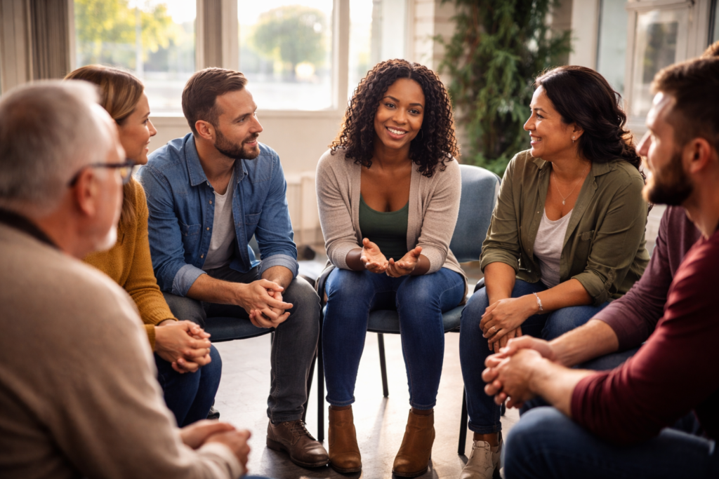 Community can take many forms. It might be a support group that meets weekly in a church basement. It might be a group of coworkers who quietly adjust schedules to help someone attend therapy appointments. It might be family members learning about boundaries and communication so they can support without enabling.