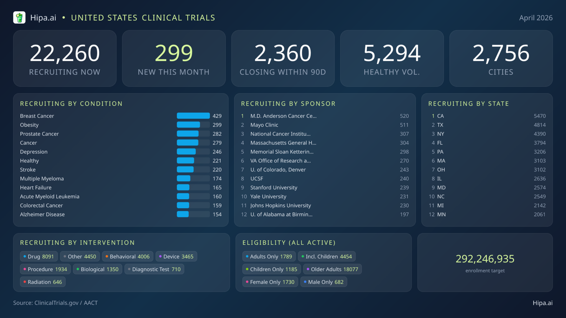 According to Hipa.ai’s April 2026 research report, there are currently more than 22,000 clinical trials recruiting participants nationwide. In addition, 299 new studies opened in April alone, while more than 2,300 studies are expected to close enrollment within the next 90 days.