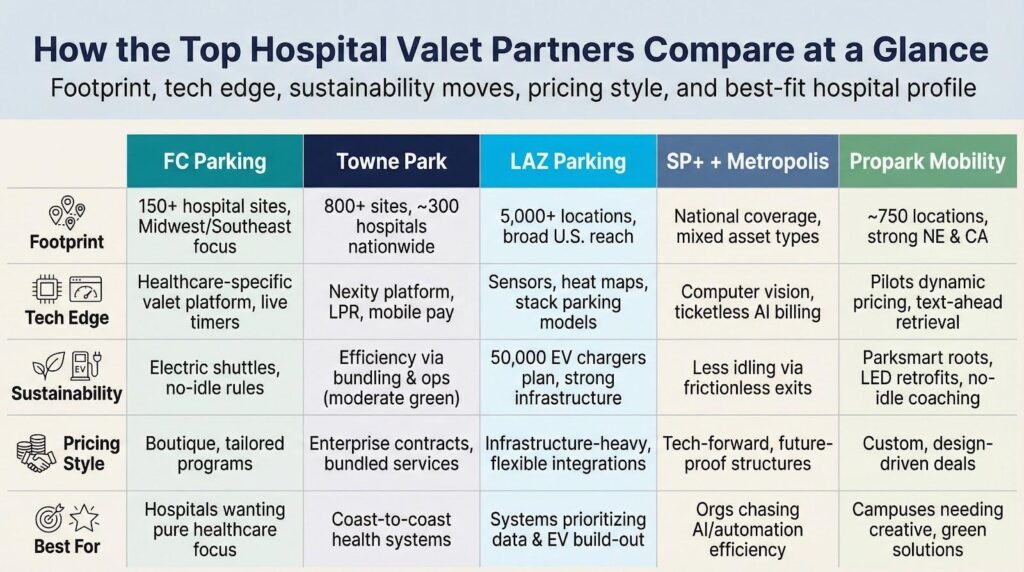 Hundreds of businesses can park cars, but only a few truly understand hospital life. We started with ten vendors pulled from recent RFPs, merger news, and award rosters.
