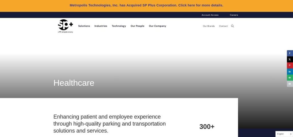 SP+ Healthcare parking and transportation services page screenshot.