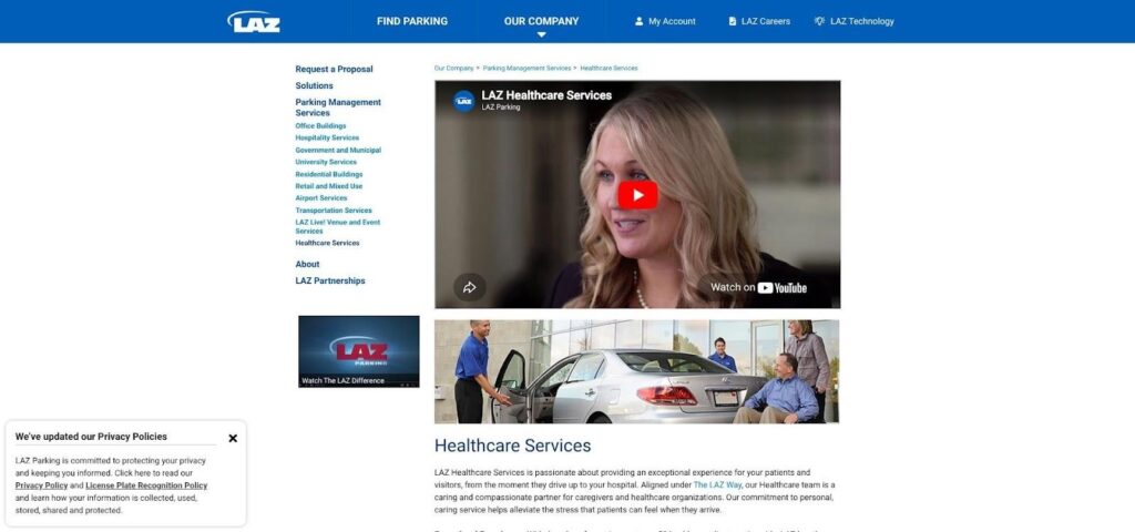 LAZ Parking medical and hospital parking services page screenshot.