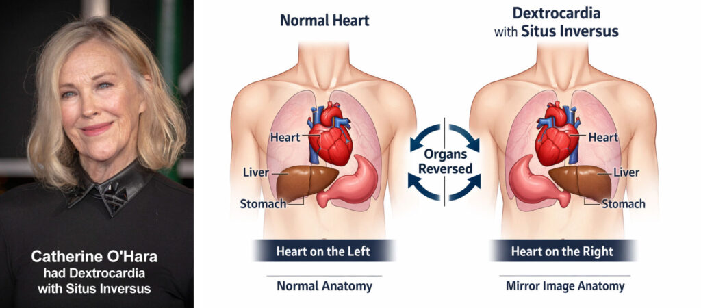 As millions search for answers about Catherine O’Hara’s cause of death, many are revisiting a rare genetic condition she previously revealed: dextrocardia with situs inversus — a congenital anatomical variation in which the heart and other organs are positioned as a mirror image of typical anatomy.