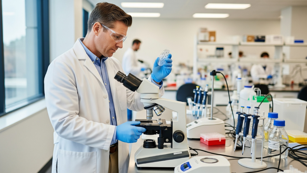 An immunoassay is a lab test that uses antibodies to identify and measure proteins in a sample. By binding to the target, antibodies help quantify how much of that molecule is present in the sample.