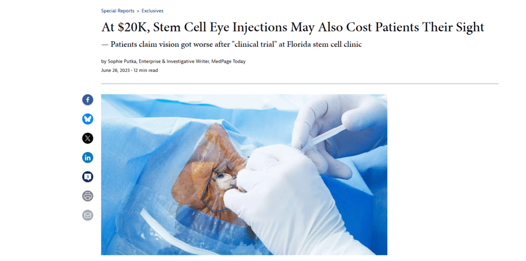In a terrifying instance, the patients at a rogue Florida clinic have paid as much as $20,000 in stem cell therapies against degenerative eye disorders only to lose their vision completely.