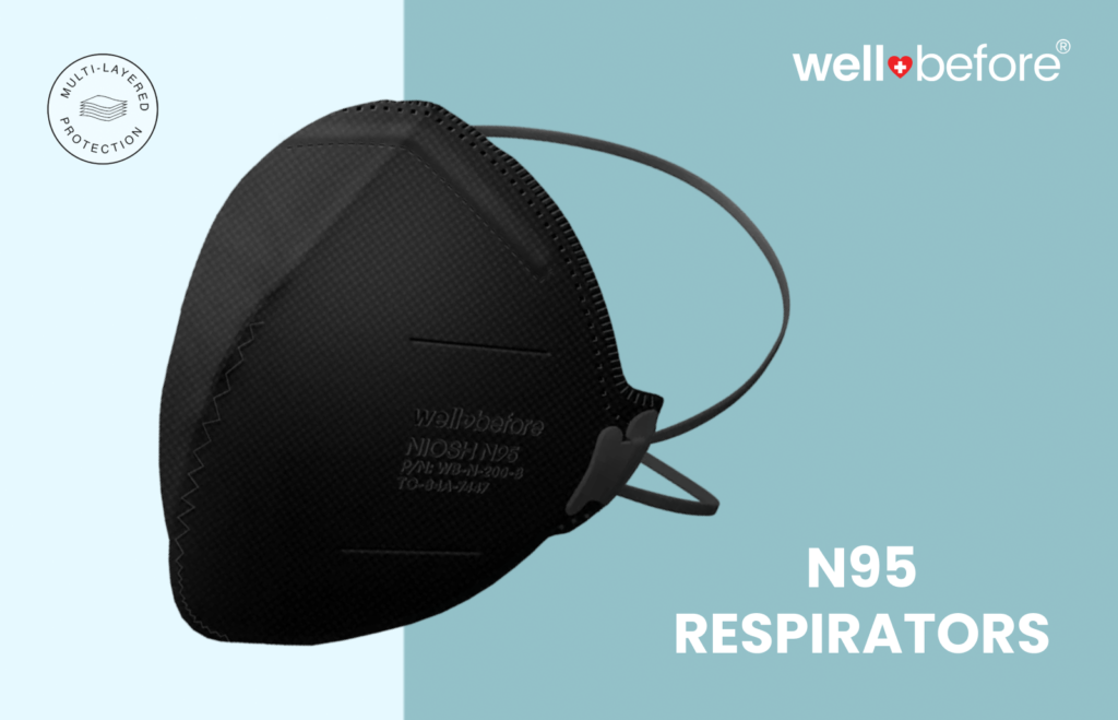 WellBefore produces and distributes its own NIOSH-approved N95 respirators, each carrying the approval number and manufacturer details printed directly on the mask.