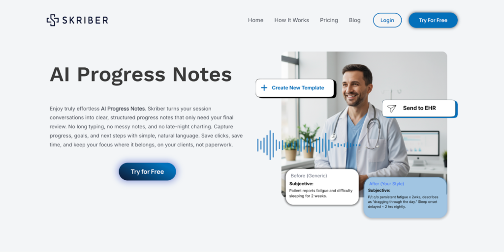 Skriber is an ambient scribe and dictation that turns session conversations into structured progress notes tailored to your voice. According to vendor documentation, it supports custom templates and HIPAA‑ready workflows.