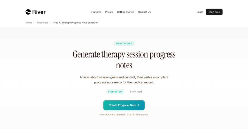River is a free, guided input tool that structures therapy session details into properly formatted progress notes, capturing interventions, progress, and plan.