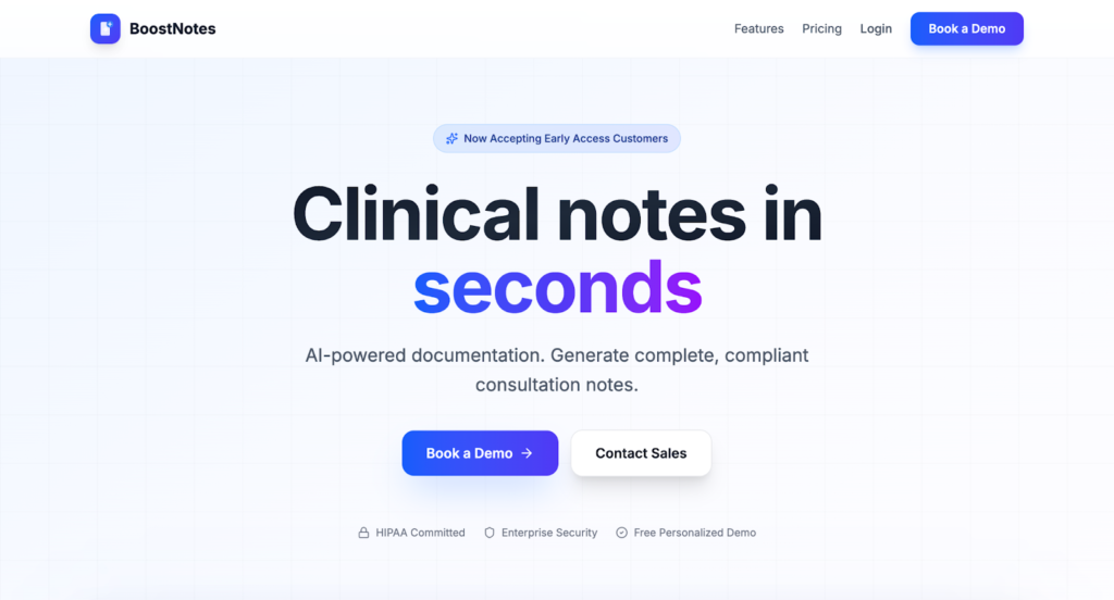 BoostNotes is an AI clinical documentation tool that claims to generate complete, compliant consultation and progress notes in under a minute.
