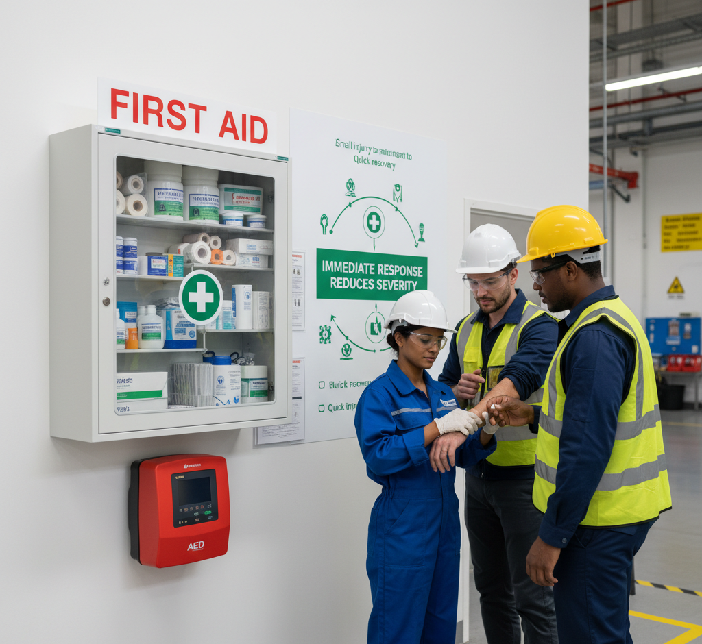 - Manufacturing plants report lower incident rates and faster recovery times after implementing designated first aid areas.